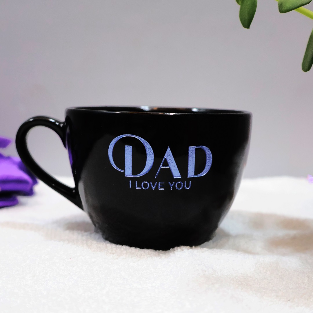 This premium black high-grade ceramic mug features a deep-engraved message in a rare metallic sapphire blue finish that beautifully stands out.